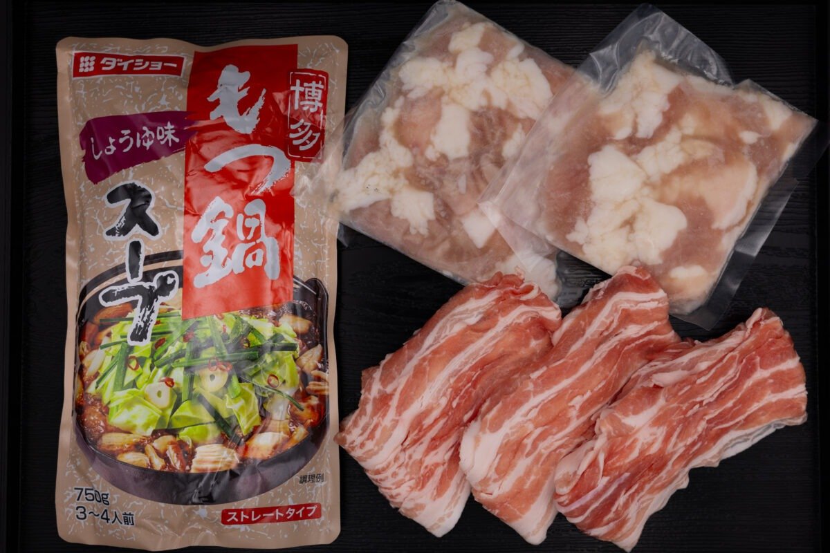 This set has 300g of pork belly shabu shabu and 300g of small intestine, and a motsu nabe soup stock.